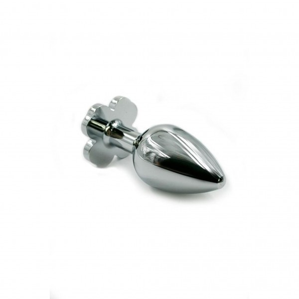 Маленькая, металлическая, серебристая анальная пробка классической, каплевидной формы и основанием в виде листа клевера