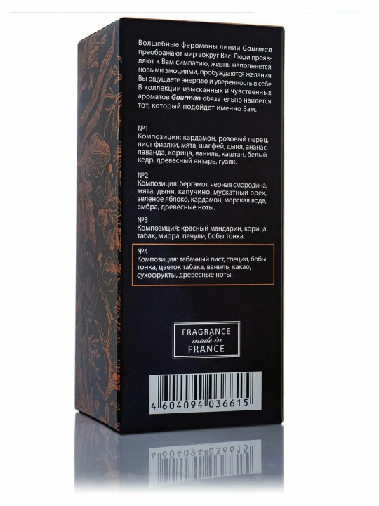Тандем восточного древесного аромата и возбуждающих феромонов мужской туалетной воды "Gourman" №4 составлен из нот табачного листа, специй, бобов тонка ванили, какао и сухофруктов.