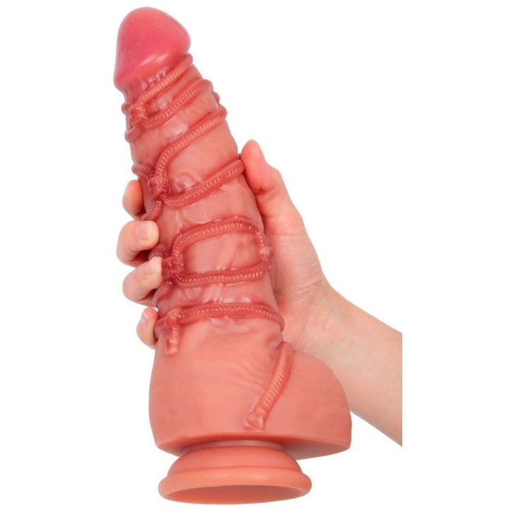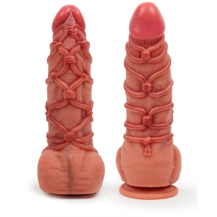 Реалистичный фаллоимитатор с мошонкой и имитацией верёвки в стиле "Шибари".