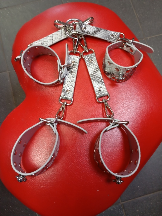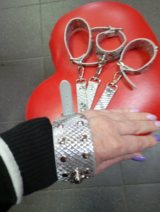 Фиксация выполнена в стильном серебристом цвете с рисунком кожи змеи цвете. Наручники и поножи сделаны из цельных полосок кожи, по центру каждого элемента есть металлическая петля и металлические клепки. Ремешок имеет ременную застежку и 6 отверстий для фиксации. Таким образом фиксация изумительно подойдет как для хрупких женских запястий и щиколоток, так и для сильных мужских.