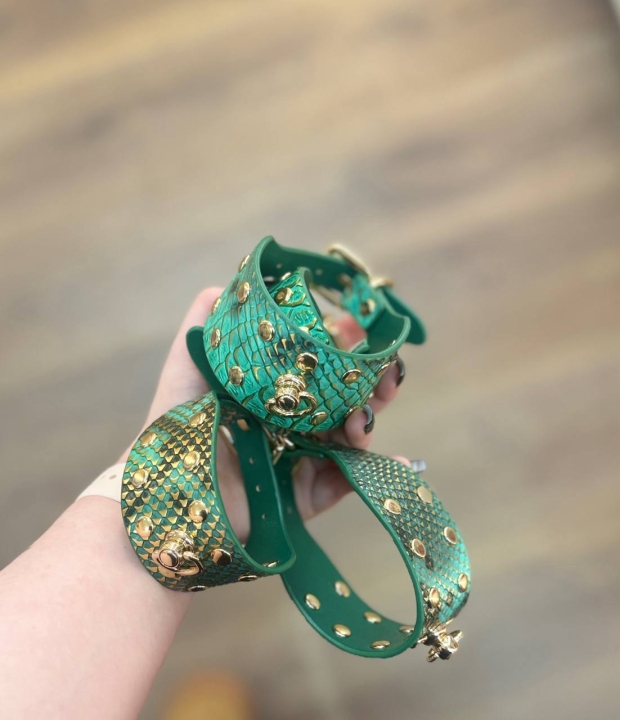 Набор изготовлен из качественной кожи глубокого зеленого оттенка с износостойкой металлической золотой фурнитурой. Этот выразительный контраст — блеск металла и благородный тон кожи — превращает утилитарный инструмент в эффектный элемент власти и соблазна. Укороченная конструкция манжет обеспечивает повышенную плотность фиксации, что оценят поклонники дисциплинарных практик. Комплект подходит как для начинающих благодаря продуманной безопасности, так и для опытных пользователей, ищущих стильный и надежный инвентарь.