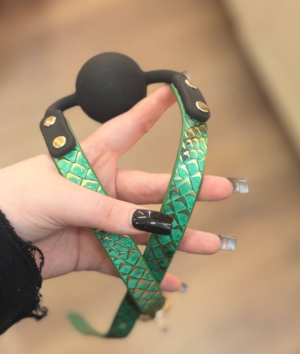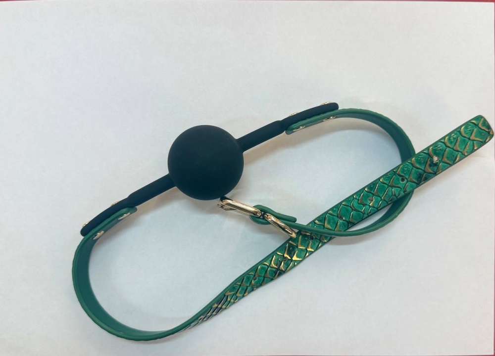 Стильный кляп на кожаных ремешках с рисунком кожи змеи.