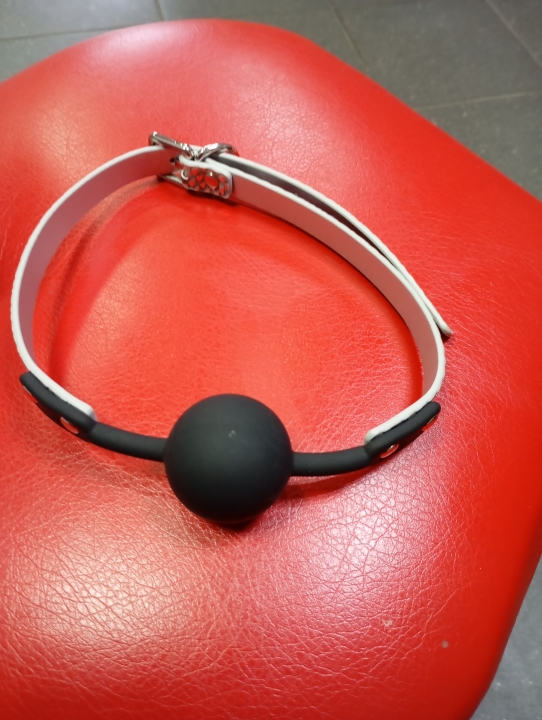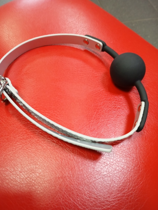 Кляп изготовлен из гипоаллергенного медицинского силикона, черного цвета. Материал приятный, бархатистый на ощупь. Силикон слегка прогибается под давлением, что позволяет обезопасить Ваши зубки. Кляп имеет форму цельнолитого шара, перетекающего в перемычки, которые крепятся к лентам фиксации металлическими заклепками. Кляп не имеет выраженных швов и стыков.