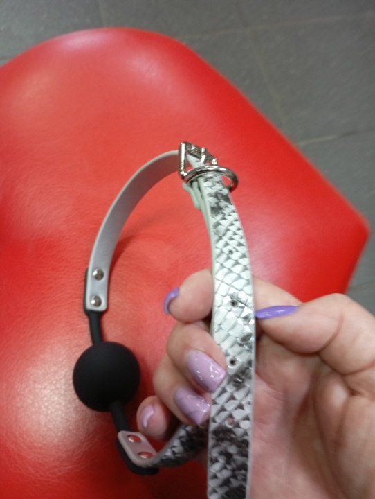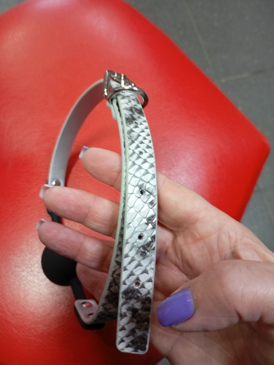 Ремешки фиксации кляпа изготовлены из натуральной выделанной кожи, наружная часть серебристого с рисунком кожи змеи цвета, внутренняя серого. Ремешки мягкие, не травмируют кожу, даже при тугой фиксации и интенсивных движениях. Закрепляется фиксация при помощи металлической застежки.