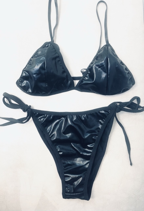 Плотный, глянцевый винил идеально облегает фигуру, четко очерчивая грудь и попку, создавая эффектный силуэт. Черный атласный лиф с мягкими чашечками регулируется веревочными бретельками, обеспечивая комфорт и индивидуальную посадку. Трусики-танго с завязками по бокам добавят шарма и загадочности, позволяя вволю разгуляться фантазии и создавая интригующий образ.
