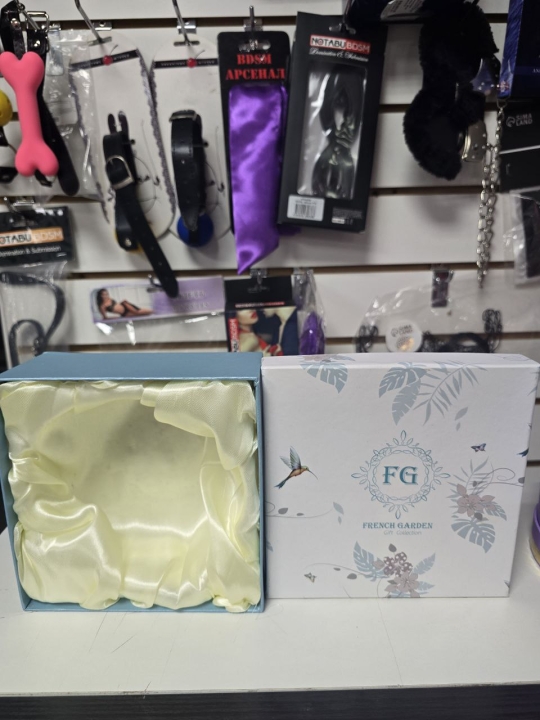 Крышка коробки украшена изящной надписью French Garden и романтичным рисунком, на котором парят колибри, порхают бабочки и цветут нежные цветы. Этот дизайн создаёт атмосферу таинственности и чувственности, идеально подходящую для подарка на День влюблённых, девичника или просто для того, чтобы сделать близкому человеку неожиданный и пикантный сюрприз.