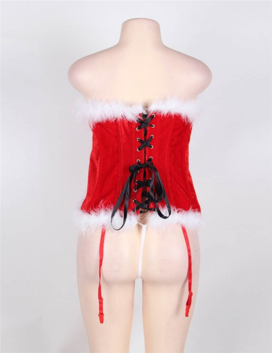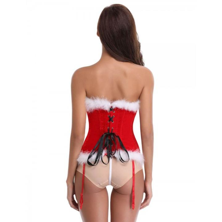 Корсет изготовлен из плотной бархатистой ткани насыщенного красного цвета. По нижнему и верхнему краям корсета пришита белая опушка. Корсет без лямок. Лиф низкий на косточках, большая часть груди остаётся открытой и эротично приподнятой.