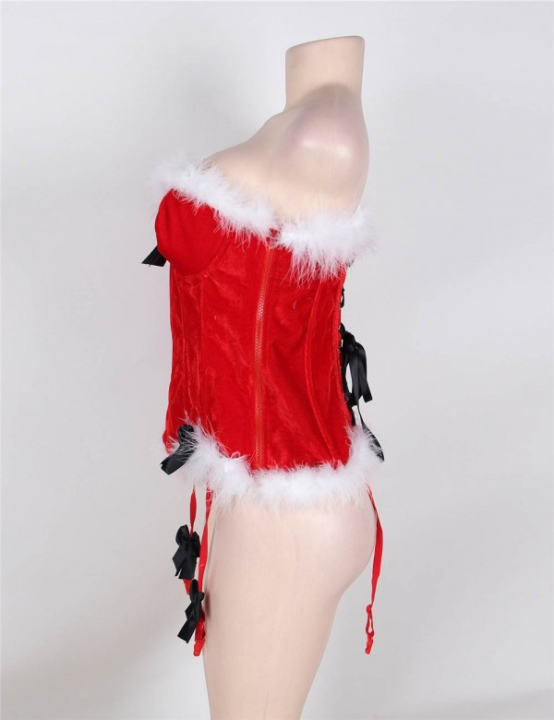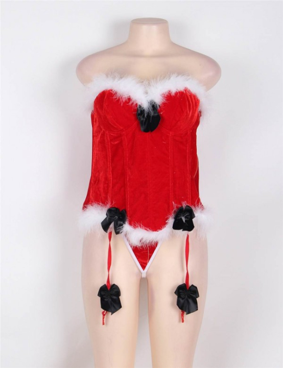 Кокетливые черные атласные бантики декорируют лиф, места крепления пажей для чулок и сами пажи. Пажи съёмные, легко снимаются и цепляются обратно. Пажи регулируются по высоте. В комплект входят трусики стринги из красной бархатистой ткани с белой окантовкой.