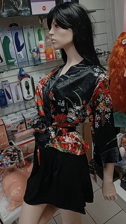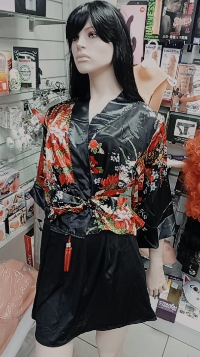 Этот костюм состоит из чёрной юбки на липучке, трусиков-стрингов и лёгкого халатика-кимоно из гладкой, блестящей на свету ткани, очень нежной и приятной к телу . На чёрном фоне пёстрой палитрой сияют яркие цветы, от которых будто веет пряным сладким ароматом. Поддержать скользящую ткань поможет пояс длиной 144 см. Также имеются внутренние тонкие чёрные пояски. Длина халатика от плеча до подола – 56 см, а длина юбки 41 см. Юбочка оказывается чуть длиннее, и ткань халатика-кимоно очень красиво струится поверх неё. Также костюм украшен алыми кисточками с жемчужными бусинками.