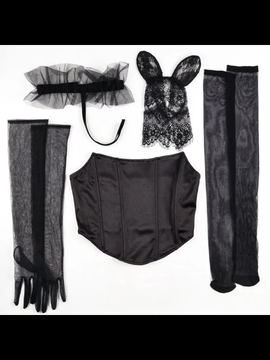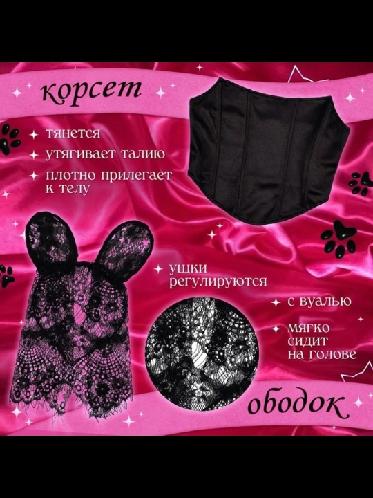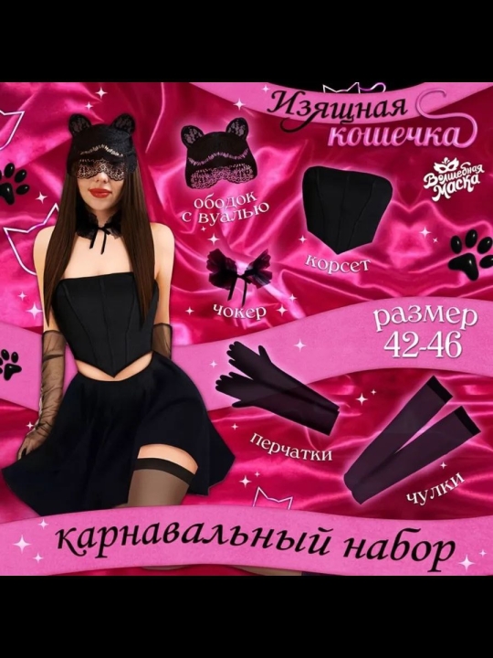 Чёрный ободочек с изящной вуалью добавит образу загадочности, корсет подчеркнёт все ваши достоинства, чокер дополнит ваш образ, а перчатки с чулками зашлифуют ваш образ и подчеркнут вашу сексуальность. А приятный на ощупь материал не доставит неудобств.