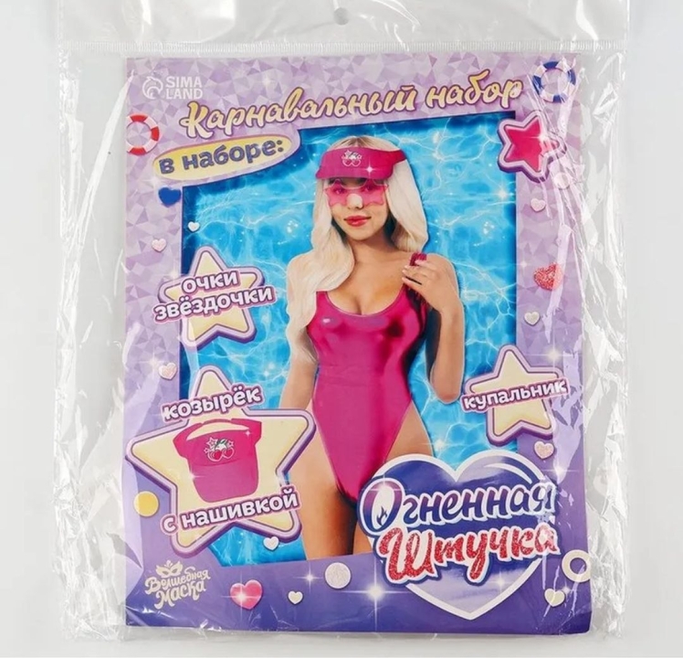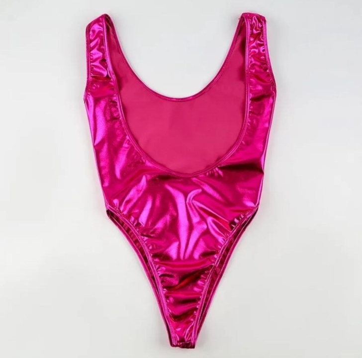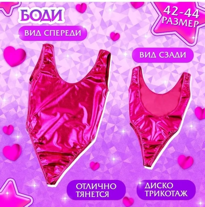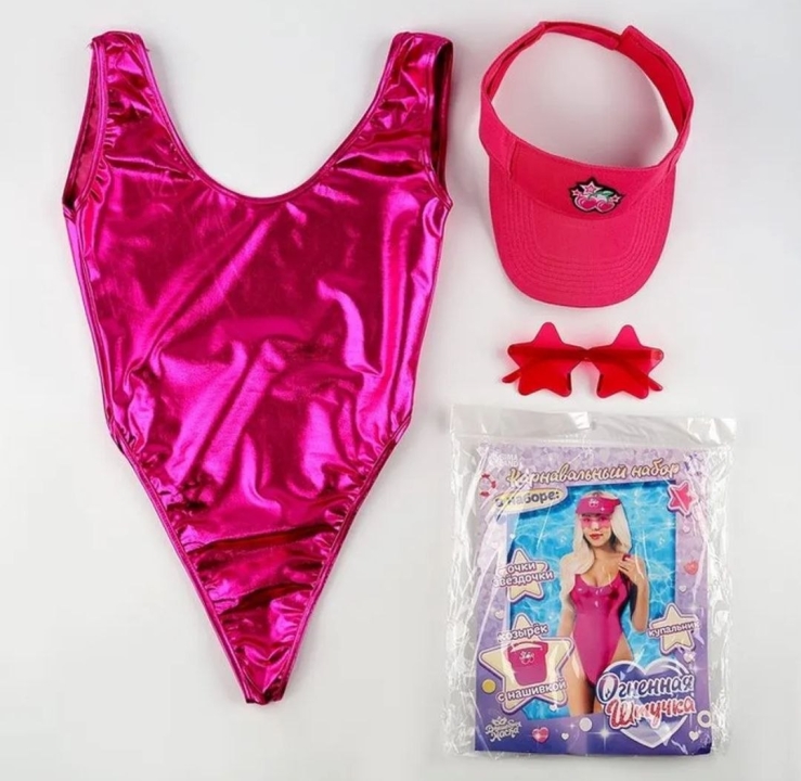 Набор включает в себя розовое боди с эффектным металлическим блеском, которое идеально облегает фигуру, стильную кепку и розовые очки. Модель отличается откровенным и одновременно нежным дизайном, подчёркивающим все достоинства тела: