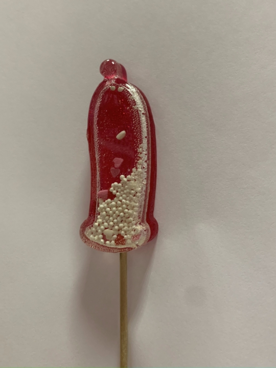 Схедобная эротическая конфетка на палочке - Презерватив с бусинками внутри - это не только веселый, но и вкусный сюрприз, ведь леденец съедобен, да еще как! Сделана милая конфетка из изомальта (низкокалорийная растительная замена сахара), внутри кондитерская посыпка делающая леденец погремушкой. Спереди конфета полностью прозрачная, сзади розового цвета. Выглядит очень ярко и цепляюще взгляд. Вкус леденца приятный ягодный, не приторный.