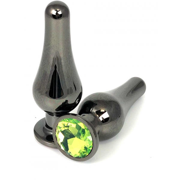 Анальная пробка удлиненной формы из металла чёрного цвета с бледно желтым кристаллом с оттеком зеленого. Размер М