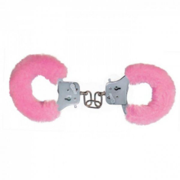 Металлические тонкие наручники в оправе из искусственного меха розового цвета