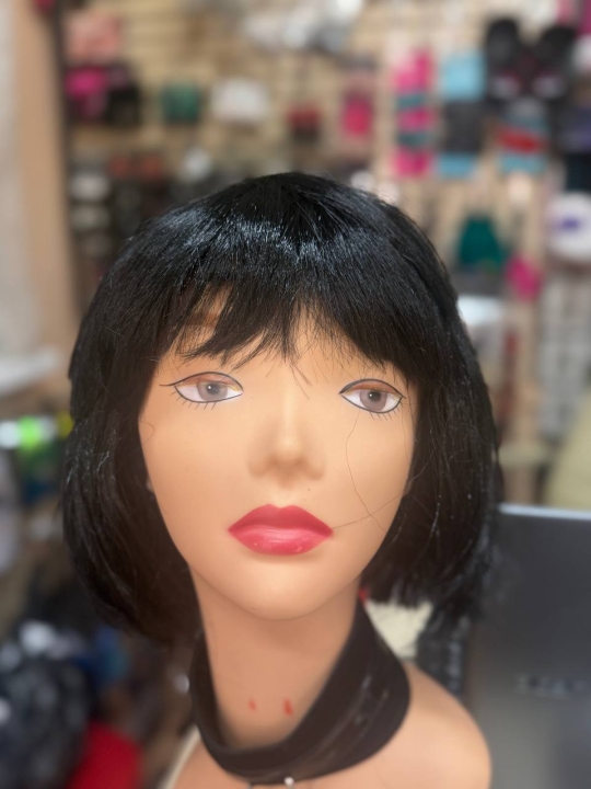стильная стрижка боб-каре с удлиненными прядями у лица и челкой, глубокий черный цвет, искусственный волос
