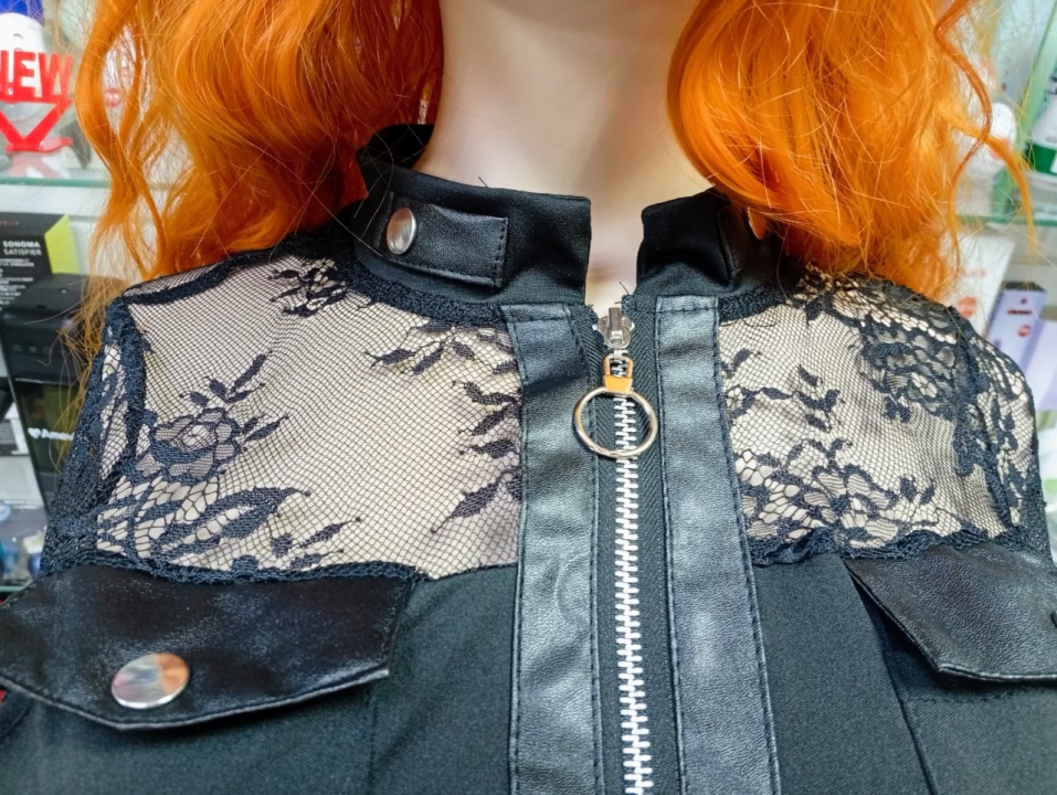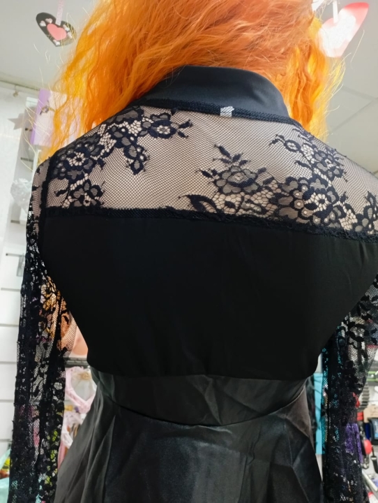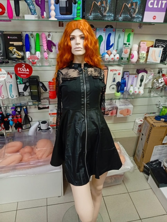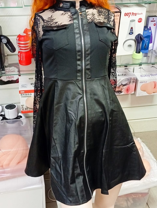 подробное описаниеЭто платье – гармоничное сочетание бунтарства и чувственности. Сочетание трёх видов ткани создаёт стильный альянс, достойный быть в Вашем гардеробе, не только в интимном. Юбка, манжеты, а также вставки на груди и воротничке выполнены из такни, имитирующей блестящую мягкую кожу. Верх платья выполнен из чёрной тянущейся ткани и чёрного кружева, которое переходит в длинный изящный рукав.