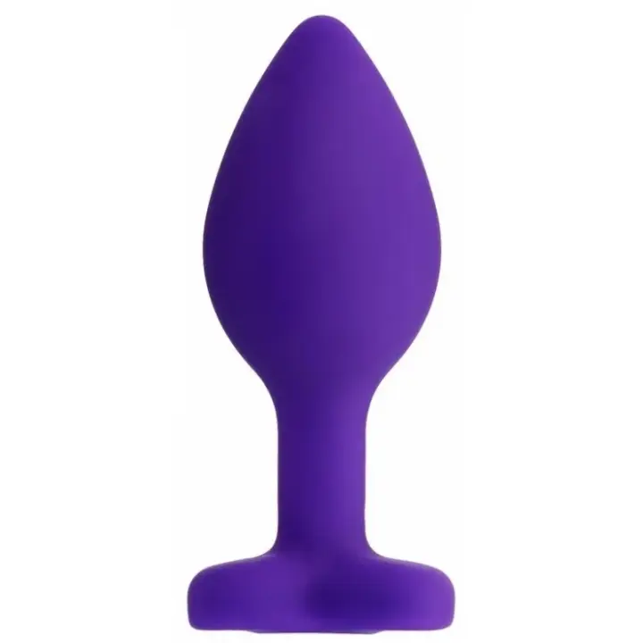 Анальная пробка из силикона фиолетового цвета, классической, каплевидной формы, с ограничителем декорированным фиолетовым стразом. Размер М.