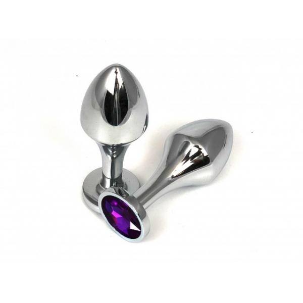 Анальная пробка из силикона фиолетового цвета, классической, каплевидной формы, с ограничителем декорированным фиолетовым стразом. Размер М.