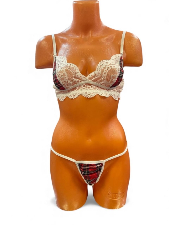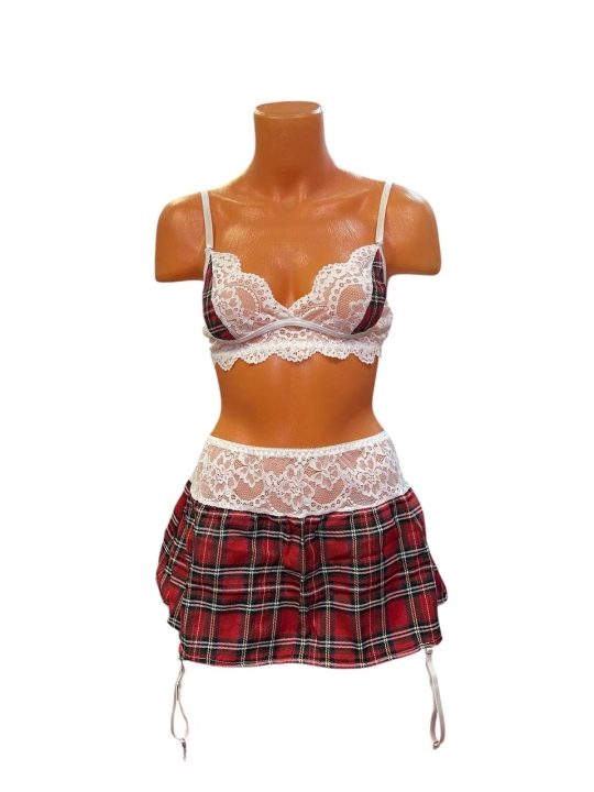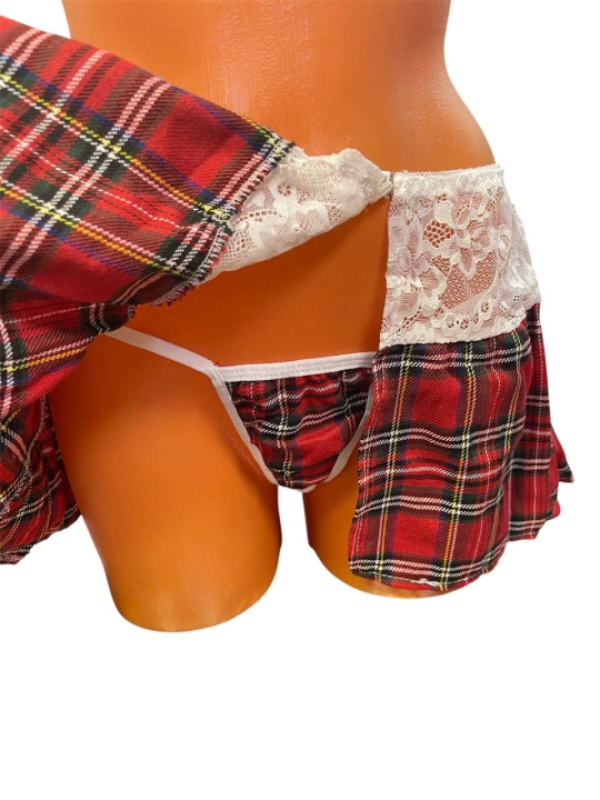 Костюм мастерски балансирует между невинностью и соблазном. Клетчатый принт отсылает к школьной форме, но стринги, пажи и кружевная отделка превращают его в коварный инструмент для игры с партнером. Каждый элемент работает на создание напряжения: то, что скрыто, становится важнее того, что показано. Это не просто костюм — это сценарий для воображения.