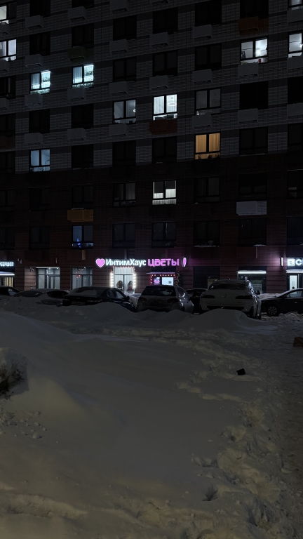 При движении из центра после съезда с моста (эстакады) слева третий дом вдоль дороги . В отдельно стоящем 17 этажном коричневом доме га первом этаже Вход с улицы совместно с павильоном Цветы слева от нас СВШ - Самая Вкусная Шаурма, а справа медицинская лаборатория Днком Секс-шоп ИнтимХаус располагается в средней части фасада торговой галереи а и имеет отдельный вход.